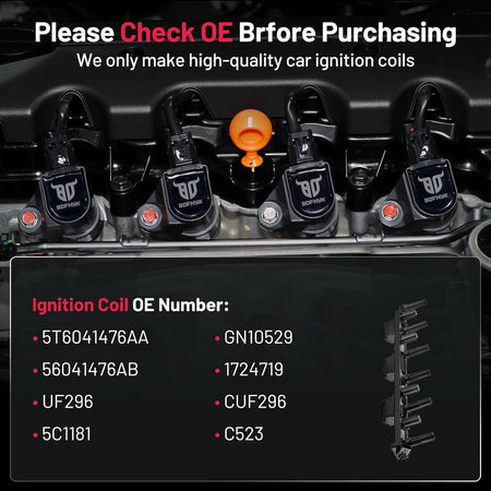 【Coils Features】:OE Standard Performance & Durability TS16949 Certified Manufacturer.Made of high grade materials such as Germany imported PBT and U.S. domestic PPO to enhance the heat resistant, Abrasion resistant, Corrosion resistant and prolong life of the coil. Strict quality control and extreme conditions are tested to ensure that the coil can output high voltage stably.