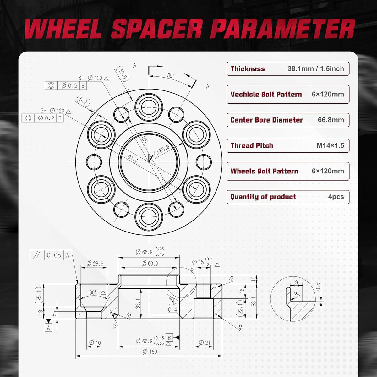 【Product Specs:】Set of 4 1.5inch /38.1mm Thickness | 6x120mm Wheel Bolt Pattern | 66.9mm Center Bore | M14x1.5 Thread Pitch | Protective gloves| Cleaning wire balls.