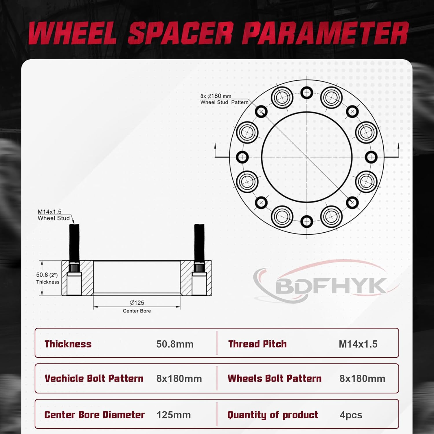 Product Specs: 2 inch/50 mm Thickness, 8x180 mm Wheel Bolt Pattern, 125 mm Center Bore, M14x1.5 Thread Pitch (without lip hub), Protective gloves| Cleaning wire balls