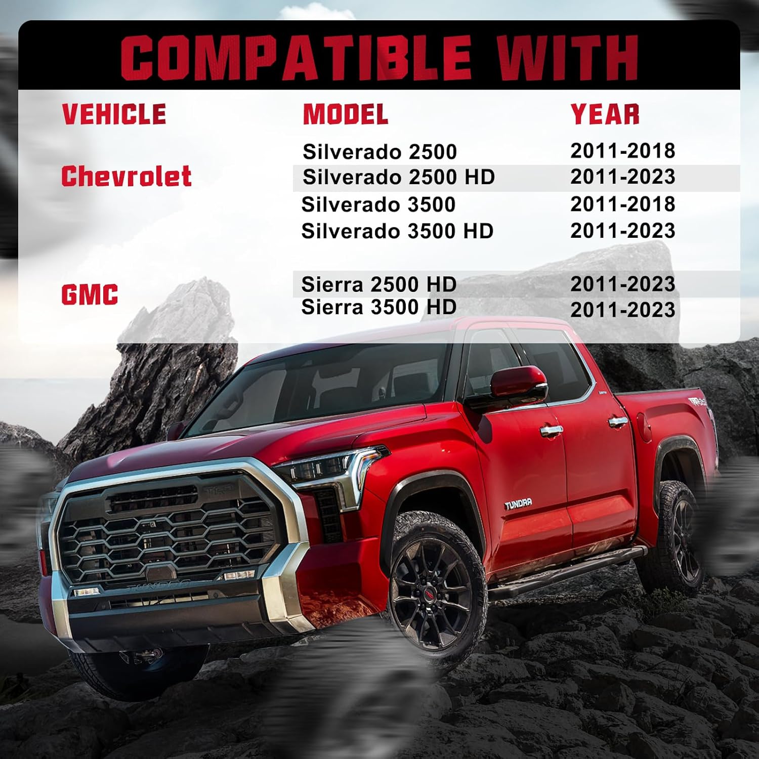 Basic Info: Wheel Spacers Compatible with Chevrolet Silverado 2500 2011-2018, Silverado 2500 HD 2011-2023, Silverado 3500 2011-2018, Silverado 3500 HD 2011-2023, Compatible with GMC Sierra 2500 HD 2011-2022, Sierra 3500 HD 2011-2022. Please check the detail fitting info from the pics or detail page. 12 months warranty and lifetime after-sales service are furnished after bought our products. Please choose a suitable one with confidence