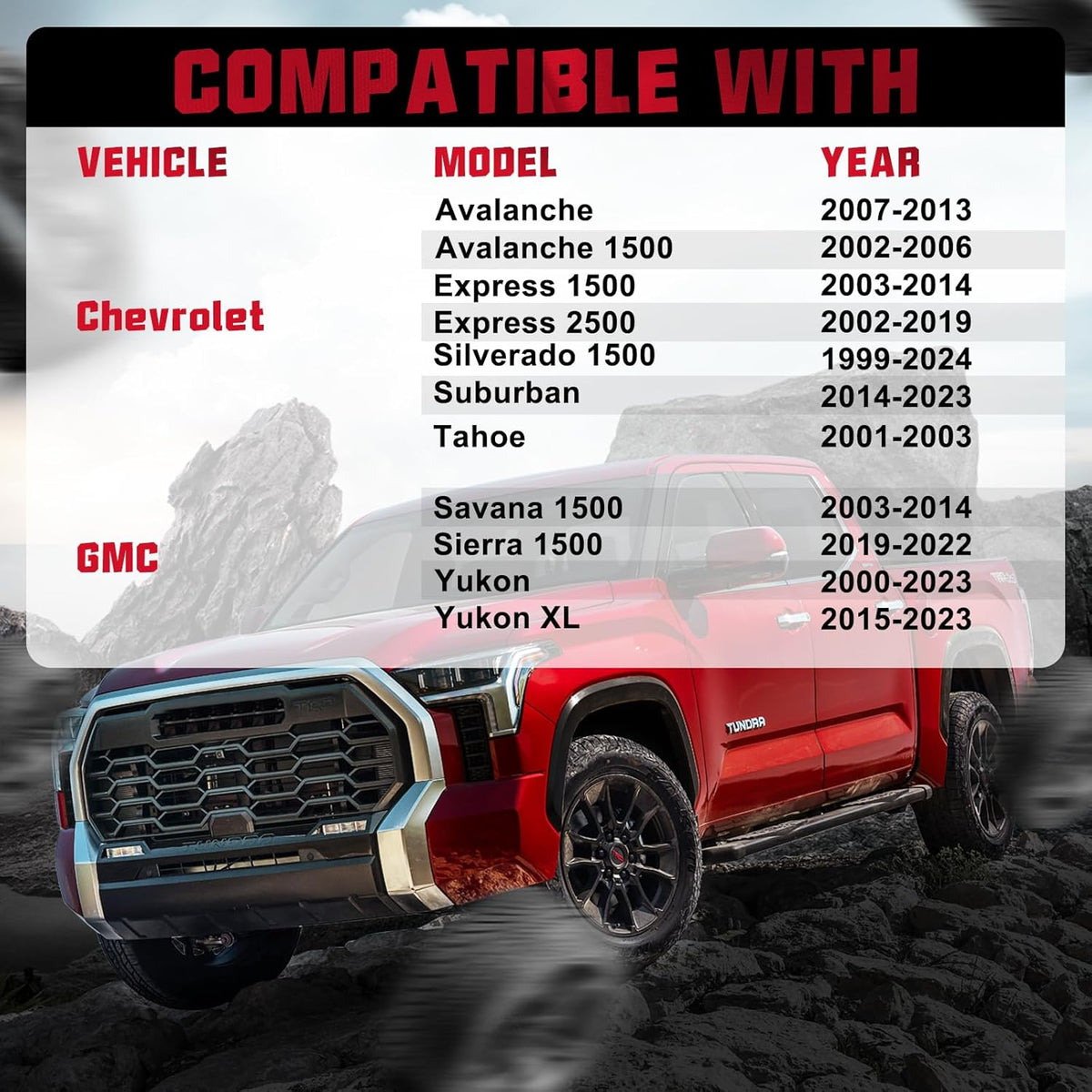 Basic Info: Wheel Spacers Compatible with Chevy Avalanche 2007-2013; Avalanche 1500 2002-2006; Express 1500 2003-2014; Express 2500 2002-2019; Silverado 1500 1999-2024; Suburban 2014-2023; Tahoe 2001-2023, Compatible with GMC Savana 1500 2003-2014, Sierra 1500 2019-2022, Yukon 2000-2023, Yukon XL 2015-2023. Please check the detail fitting info from the pics or detail page. 12 months warranty and lifetime after-sales service are furnished after bought our products. Please choose a suitable one with confidence