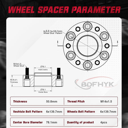 Product Specs: 2 inch/50 mm Thickness | 6x139.5 mm Wheel Bolt Pattern | 78.1 mm Center Bore | M14x1.5 Thread Pitch | Protective gloves| Cleaning wire balls