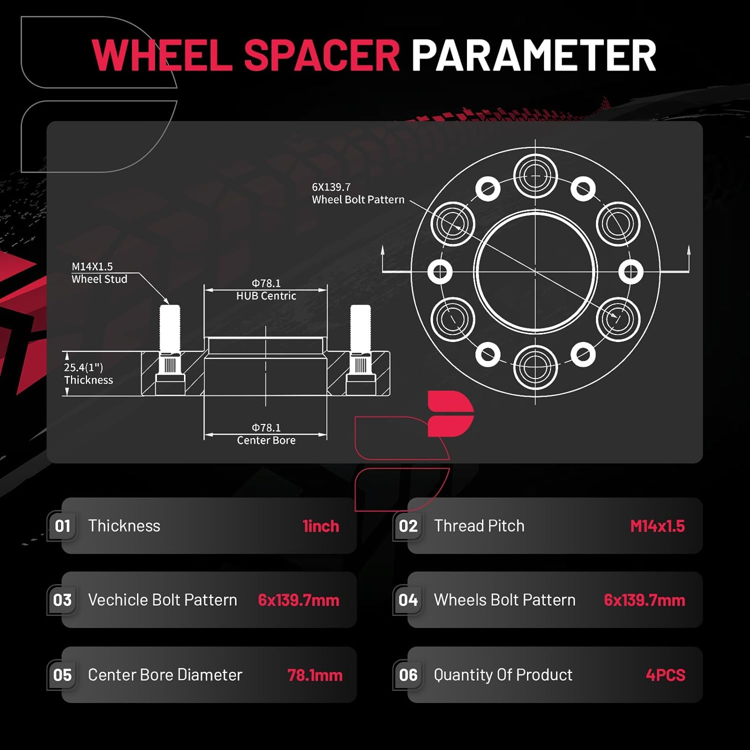 【Product Specs:】Set of 4 1 inch/25.4 mm Thickness | 6x139.7mm Wheel Bolt attern | 78.1mm Center Bore | M14x1.5 Thread Pitch | Protective gloves| Cleaning wire balls.