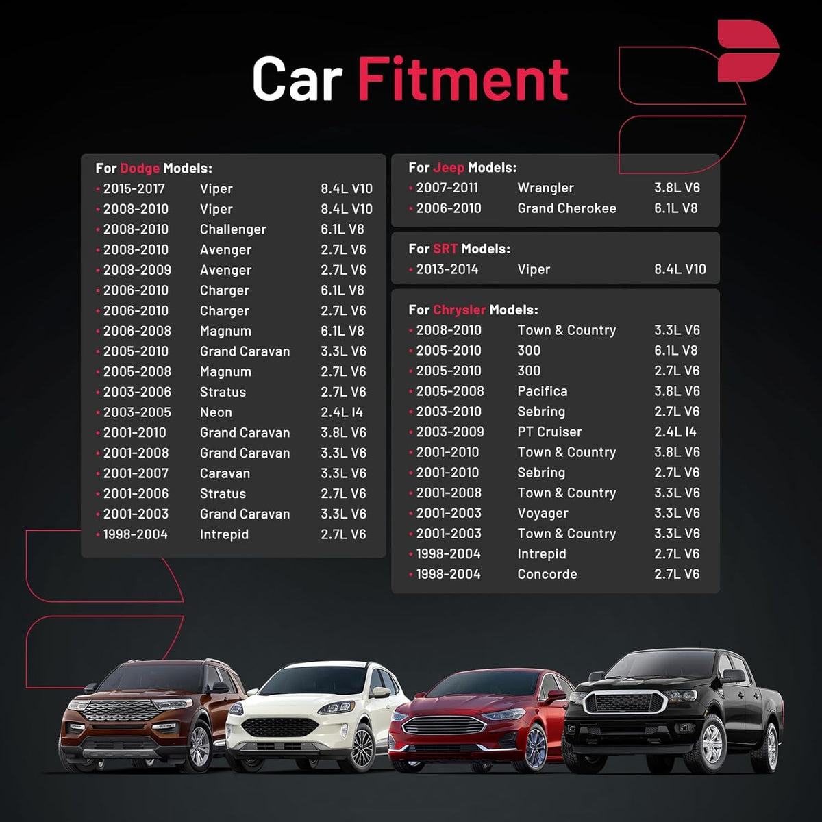 【Compatibility Information】:Spark Plug XP5426 Compatible with Chrysler 2005-2010 300, 2005-2008 Pacifica, 2003-2009 PT Cruiser, 2001-2010 Sebring, 2001-2010 Town & Country; Compatible with Dodge 2008-2010 Avenger, 2001-2007 Caravan, 2008-2010 Challenger, 2006-2010 Charger, 2001-2010 Grand Caravan, 2003-2005 Neon; Compatible with Jeep 2006-2010 Grand Cherokee, 2007-2011 Wrangler; Compatible with SRT 2013-2014 Viper; Compatible with VW 2009-2010 Routan.