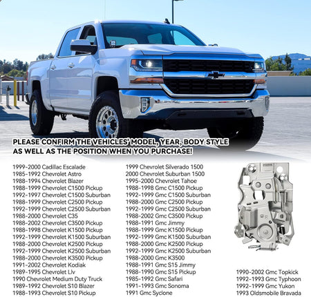 [Perfect Fit] - The lock actuator is compatible with Chevrolet Astro 1985-1992, 1988-1994 Blazer, compatible with GMC: 1988-1999 C1500 Pickup, 1988-1999 C2500 Pickup, 1988-2002 C3500 Pickup, 1988-1998 K1500 Pickup, 1988-2000 K2500 Pickup, 1988-2000 K3500 Pickup and more.(See below for the full vehicle list)