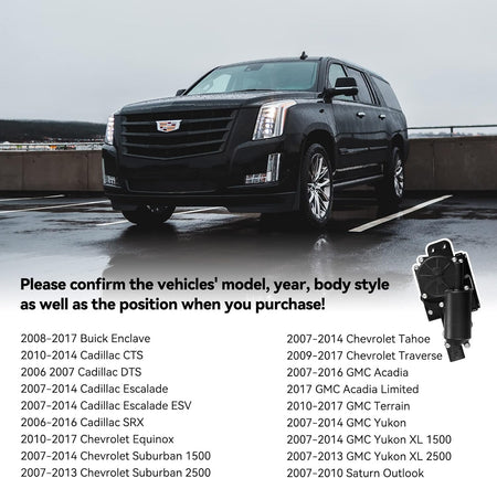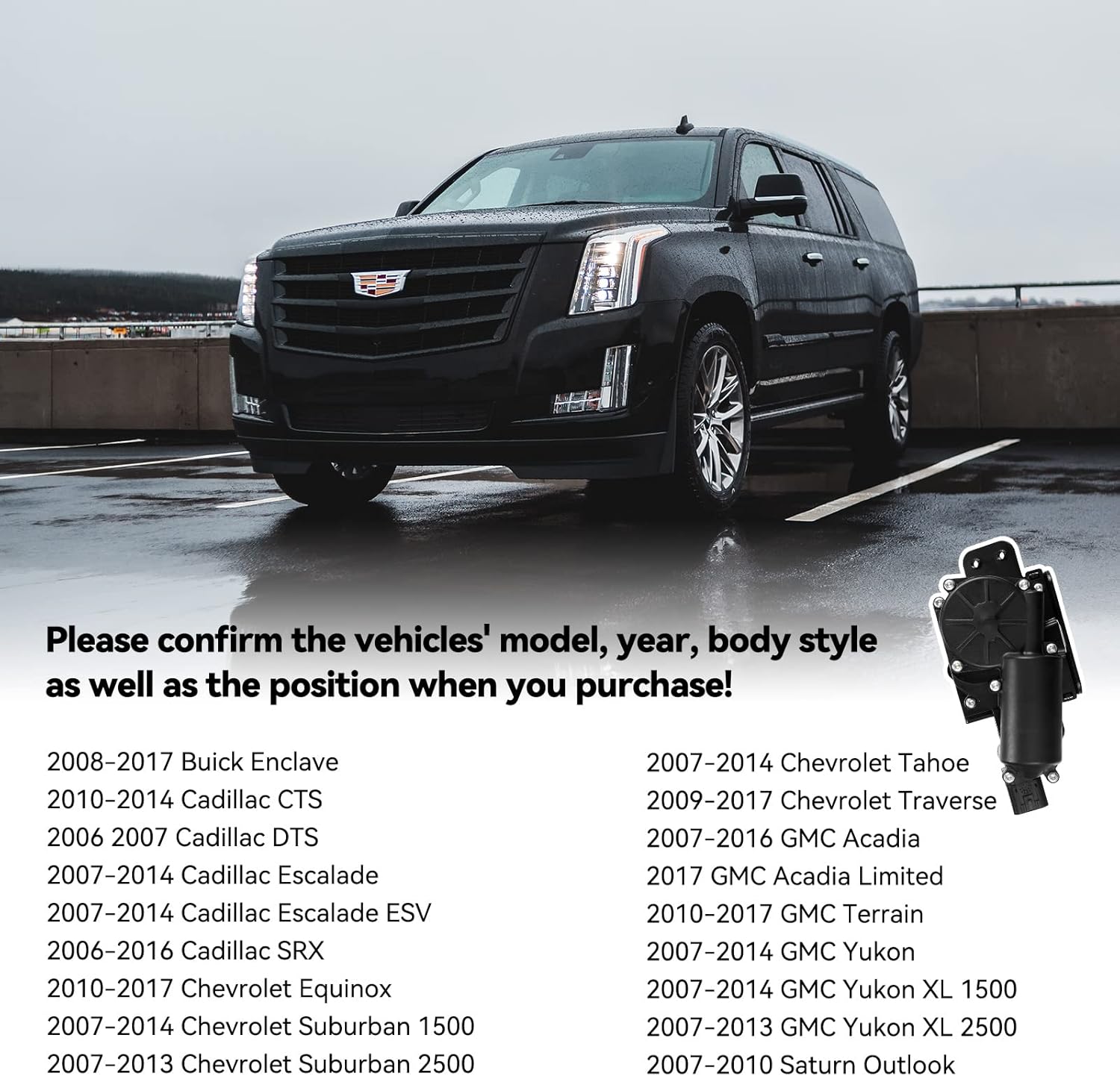 [Perfect Fit] - The lock actuator is compatible with Buick Enclave 2008-2017, compatible with Cadillac: 2010-2014 CTS, 2006 2007 DTS, 2007-2014 Escalade, 2007-2014 Escalade ESV, 2006-2016 SRX, compatible with Chevrolet: 2010-2017 Equinox, 2007-2014 Suburban 1500, 2007-2013 Suburban 2500, 2007-2014 Tahoe, 2009-2017 Traverse, compatible with GMC: 2007-2016 Acadia, 2017 Acadia Limited, 2010-2017 Terrain, 2007-2014 Yukon, 2007-2014 Yukon XL 1500, 2007-2013 Yukon XL 2500, 2007-2010 Saturn Outlook.(See below for the full vehicle list)