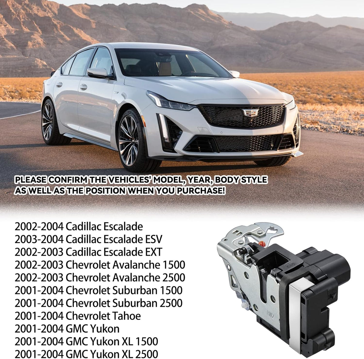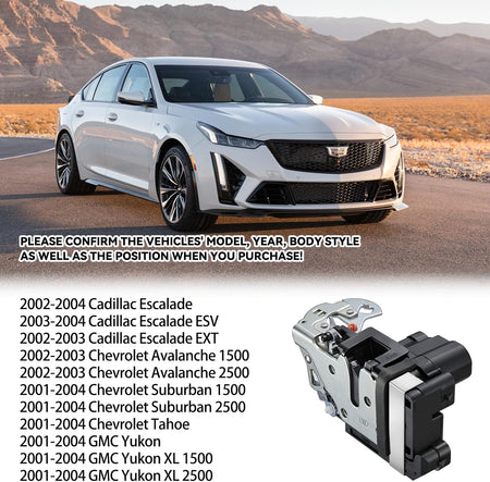 [ ] - The lock actuator is compatible with Cadillac: 2002-2004 Escalade, 2003-2004 Escalade ESV, 2002-2003 Escalade EXT; compatible with Chevrolet: 2002-2003 Avalanche 1500, 2002-2003 Avalanche 2500, 2001-2004 Suburban 1500, 2001-2004 Suburban 2500, 2001-2004 Tahoe; compatible with GMC: 2001-2004 Yukon, 2001-2004 Yukon XL 1500, 2001-2004 Yukon XL 2500. See below for the full vehicle list please