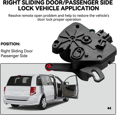 [Positions] - Replace Passenger Side and Right Sliding Door Lock Actuator: If the lifter of your vehicle cannot be locked or is not properly unlocked,the problem may be in the lock actuator, This latch is manufactured to the OE specification to provide factory-fresh appearance and direct-fit, that enables proper door locking function. OE connector helps ensure a solid, positive connection.