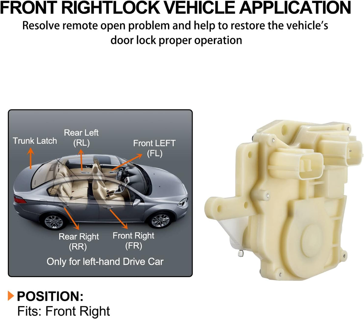 [] - Replace Front Right Passenger Side Latch Actuator. This latch is manufactured to the OE specification to provide factory-fresh appearance and direct-fit, that enables proper door locking function.
