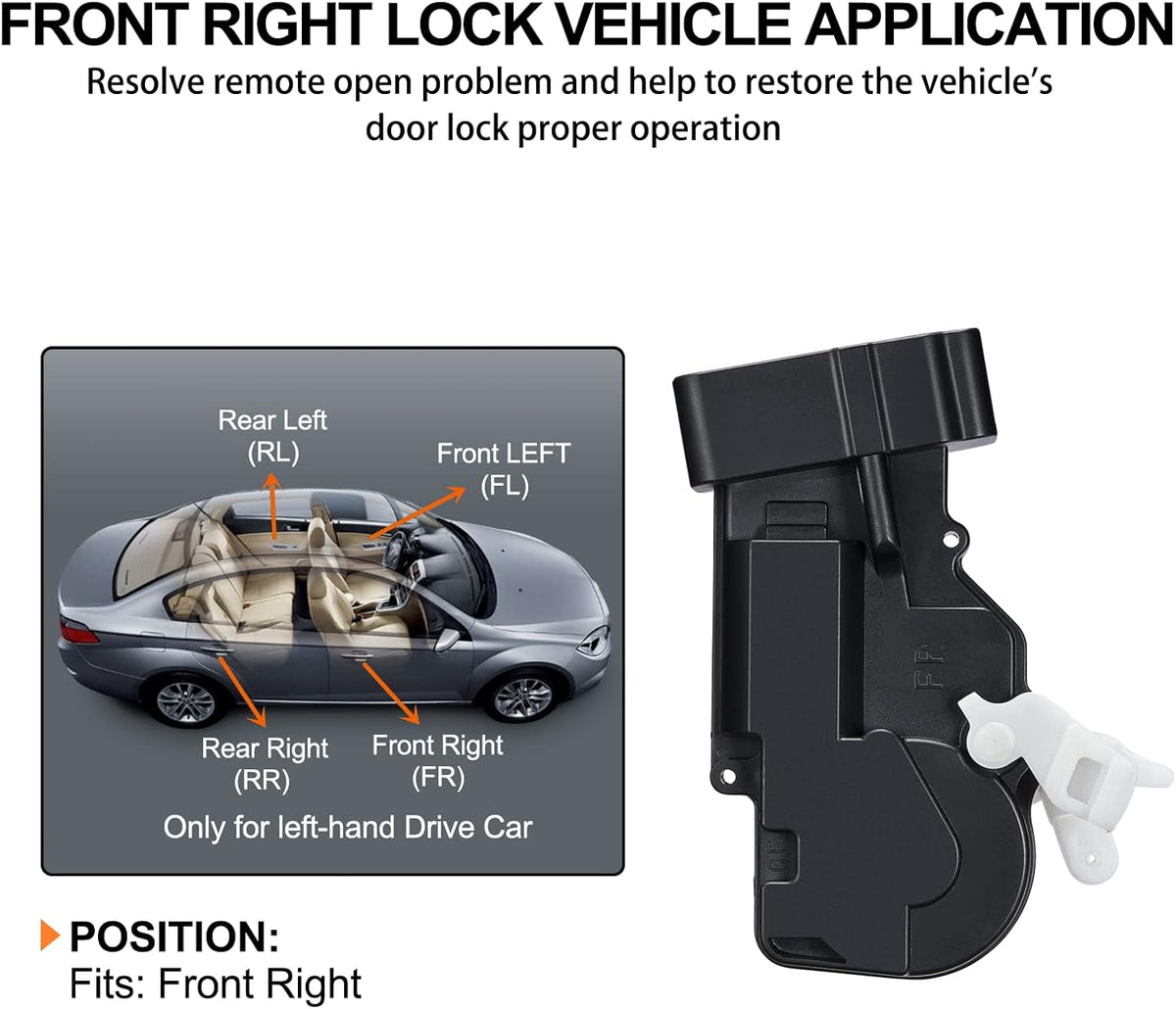 [] - Replace Front Right Passenger Side Latch Actuator. This latch is manufactured to the OE specification to provide factory-fresh appearance and direct-fit, that enables proper door locking function.
