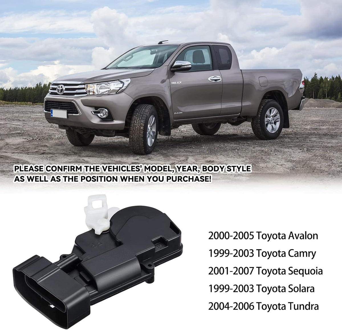 [ ] - The lock actuator is compatible with Toyota 2000-2005 Avalon, 1999-2003 Camry, 2001-2007 Sequoia, 1999-2003 Solara, 2004-2006 Tundra. See below for the full vehicle list please