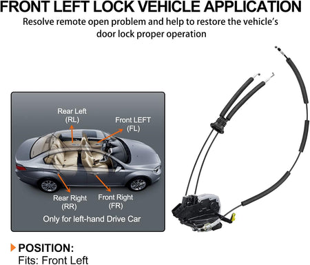 [] - Replace Front Left Driver Side Latch Actuator. This latch is manufactured to the OE specification to provide factory-fresh appearance and direct-fit, that enables proper door locking function.