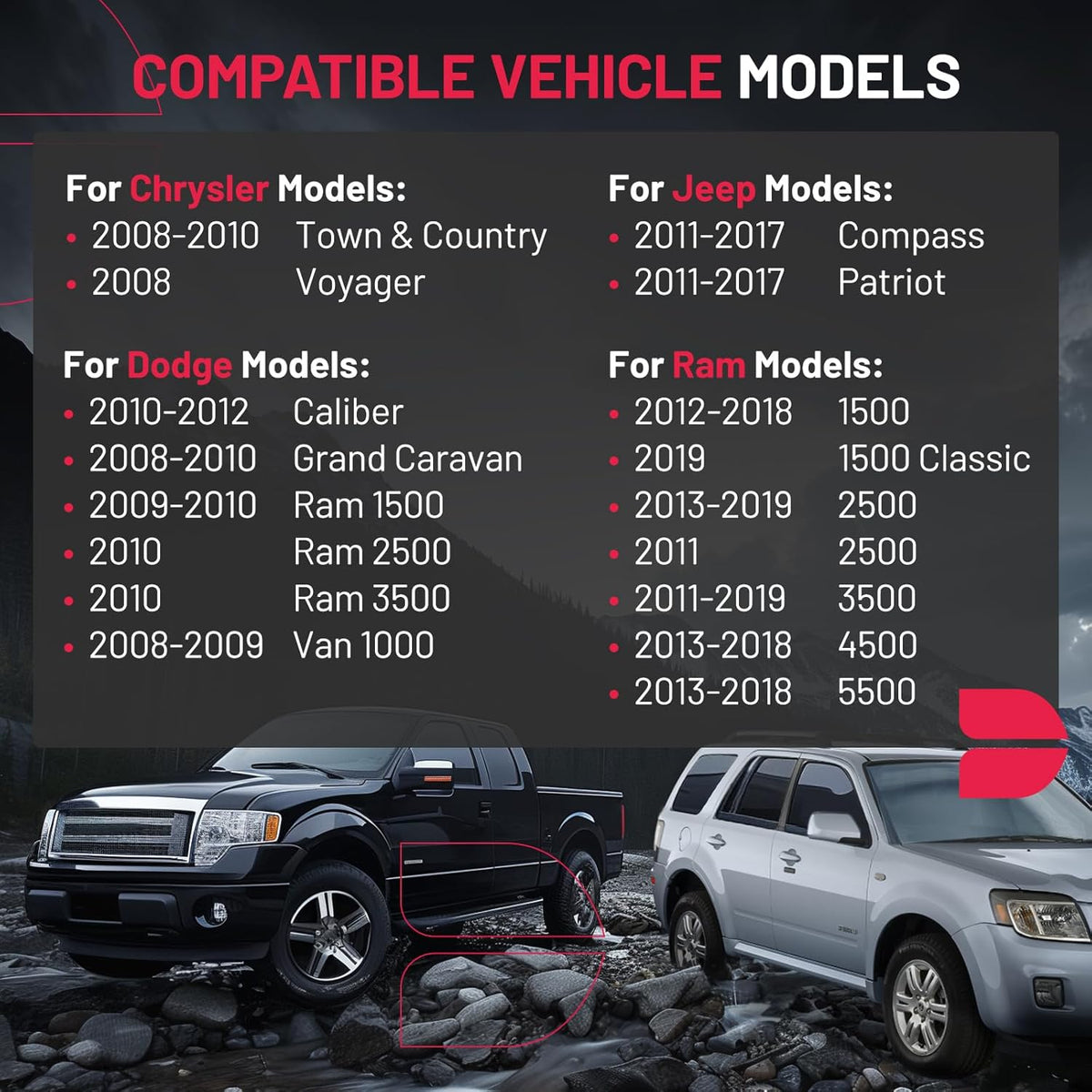 【Compatibility】The door lock latch actuator Compatible with Chrysler Town & Country 2008-2010; Voyager 2008; Compatible with Dodge Caliber 2010-2012; Grand Caravan 2008-2010; Ram 1500 2009-2010; Ram 2500 2010; Ram 3500 2010; Van 1000 2008-2009; Compatible with Jeep Compass 2011-2017; Patriot 2011-2017; Compatible with Ram 1500 2012-2018; Ram 1500 Classic 2019; Ram 2500 2013-2019; Ram 2500 2011; Ram 3500 2011-2019; Ram 4500 2013-2018; Ram 5500 2013-2018.