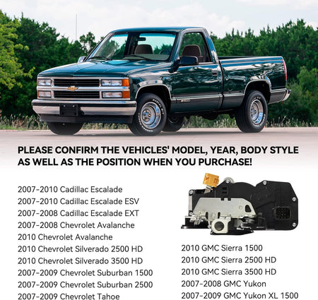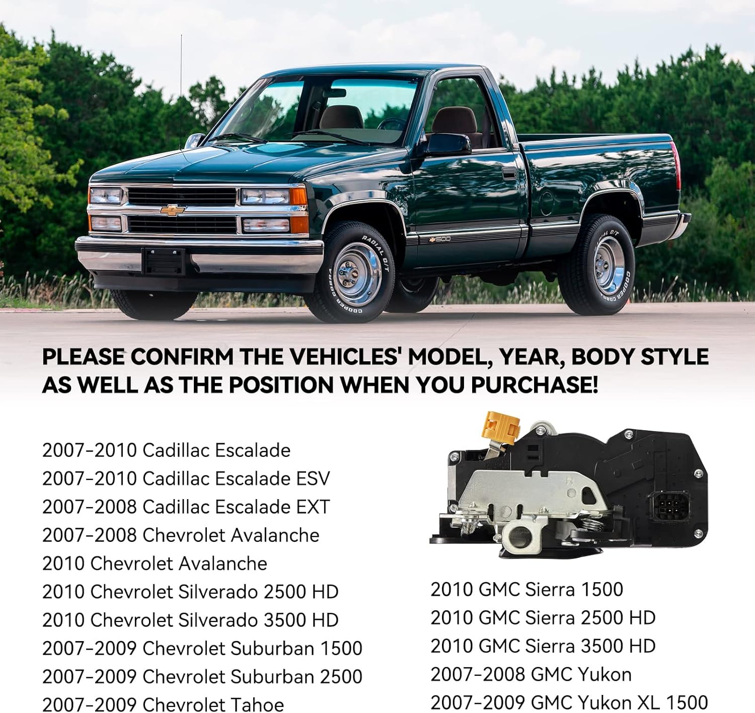 [Perfect Fit] - The lock actuator is compatible with Cadillac Escalade ESV 2007-2010, 2007-2008 Escalade EXT, Avalanche; compatible with Chevrolet 2007-2009 Suburban 1500, 2500; compatible with GMC Yukon, XL 1500 2007-2008 and more.(See below for the full vehicle list)