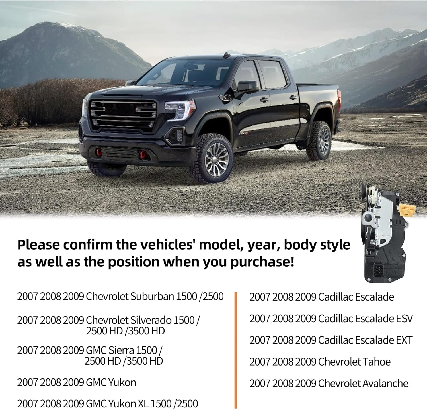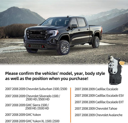 [Perfect Fit] - The lock actuator is compatible with 2007- 2009 Cadillac Escalade/Escalade ESV/Escalade EXT,Chevy Tahoe Avalanche Suburban 1500/2500,Silverado 1500 /2500 HD /3500 HD,GMC Sierra 1500 /2500 HD /3500 HD,GMC Yukon/Yukon XL 1500/2500.(See below for the full vehicle list)