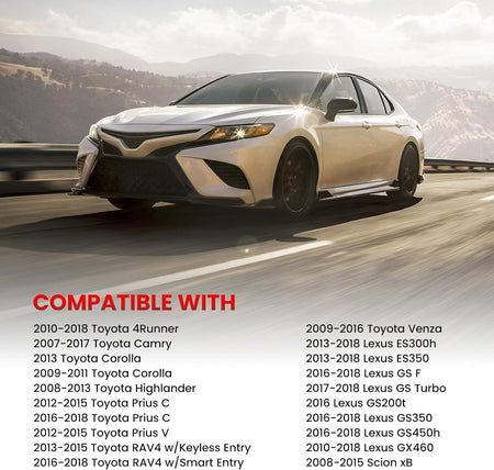 【Compatible Models】 Compatible with Toyota 4Runner 2010-2018 , Camry 2007-2017 , Corolla 2013 , Corolla 2009-2011 , Highlander 2008-2013 , Prius C 2012-2015 , Prius C 2016-2018 , Prius V 2012-2015 , RAV4 w/Keyless Entry 2013-2015 , RAV4 w/Smart Entry 2016-2018, Venza 2009-2016 ; Compatible with Lexus ES300h 2013-2018 , ES350 2013-2018 , GS F 2016-2018 , GS Turbo 2017-2018 , GS200t 2016 , GS350 2016-2018 , GS450h 2016-2018 , GX460 2010-2018 , Scion xB 2008-2015